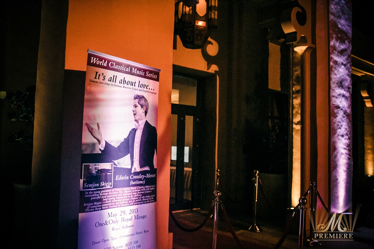 M Premiere in collaboration with The Dubai Concert Committee was proud to present the long awaited night of Opera “It’s all about love” at the end of the concert’s season on the 29th of May. The outstanding baritone from the young generation of French singers, Edwin Crossley-Mercer and a world renowned pianist Semjon Skigin performed on the stage of the Royal Ballroom at gorgeous One&Only Royal Mirage Dubai.